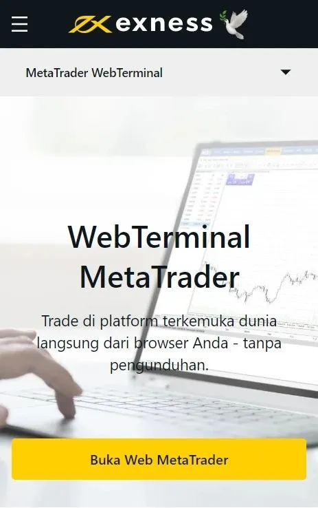 Untuk pedagang Indonesia yang memilih untuk tidak mengunduh perangkat lunak apa pun, Exness menawarkan terminal web yang memungkinkan Anda berdagang langsung dari browser Anda. Ini menyediakan fungsionalitas yang sama dengan platform desktop, menjadikannya pilihan yang nyaman dan dapat diakses. Berikut langkah-langkah untuk menggunakannya: