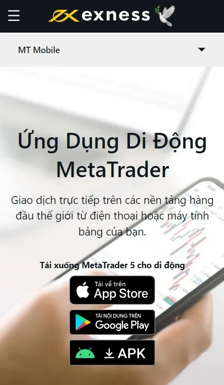 - Tải xuống MT Mobile: Để truy cập ứng dụng MetaTrader Mobile, hãy truy cập trang web chính thức của Exness và điều hướng đến phần tải xuống. Từ đó, bạn có thể tìm thấy liên kết để tải xuống ứng dụng cho thiết bị cụ thể của mình, cho dù đó là thiết bị Android hay iOS.