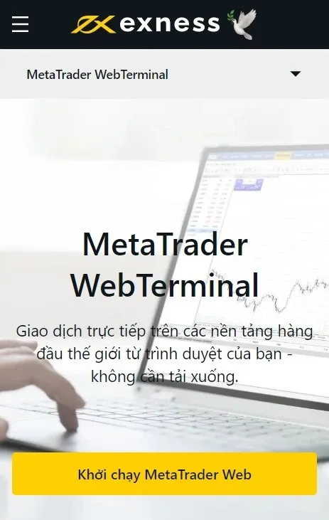 Đối với các nhà giao dịch Việt Nam không muốn tải xuống bất kỳ phần mềm nào, Exness cung cấp một thiết bị đầu cuối web cho phép bạn giao dịch trực tiếp từ trình duyệt của mình. Nó cung cấp chức năng giống như nền tảng máy tính để bàn, làm cho nó trở thành một tùy chọn thuận tiện và dễ tiếp cận. Dưới đây là các bước để sử dụng nó: